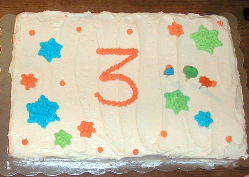 | This cake was for a big 3rd birthday party. Vanilla cake with chocolate chips and vanilla buttercream. |