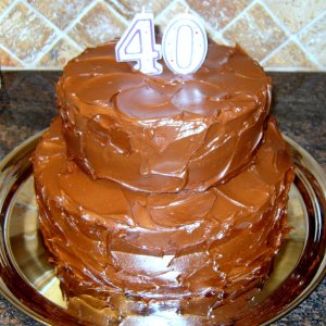 | The chocolate tiered cake was for a good friend’s 40th birthday (obviously!). He’s a chocoholic, so it was dark chocolate cake with whipped ganache frosting |