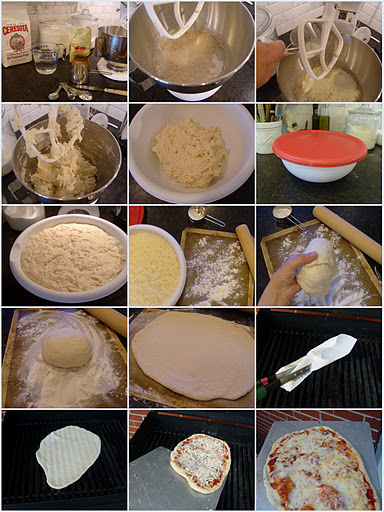 I spent exactly five minutes assembling and mixing the dough and putting into a bowl. I let it rise about two hours on the counter, and then put the bowl in the fridge.When I was ready to make pizza, I took a handful of dough (about 1/4 of the dough in the bowl) and, using lots of flour on my hands and on the dough, gently stretched it into a ball. Roll it out on a generously floured silpat, prick the dough with a fork a few times, and slide the dough right onto the oiled, preheated (500 degrees) grill rack.
