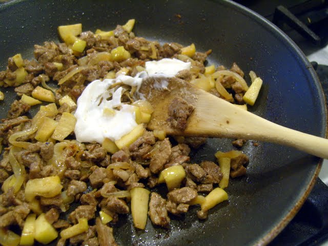 Brown the onions in a little olive oil over medium-high heat. When they start to get translucent, add the diced apple. When the apple begins to brown and soften, add the diced lamb (or you can remove the apples and onions and set aside, so that picky eaters can have their meat all by itself). Add the spices to the lamb and heat until the meat is hot and begins to sizzle.