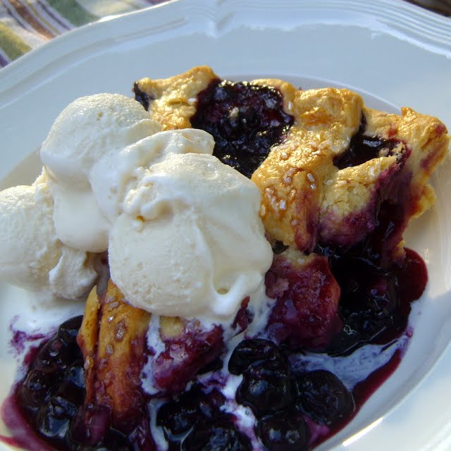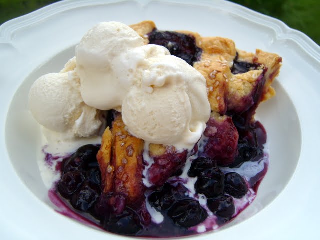 That evening we celebrated with grilled steak, creamed spinach, and blueberry pie with ice cream. We ate our pie outside on the patio to catch the breeze. Mmmmm…summer. You’re not going to get such a pie in any other season. The blueberries were juicy and jammy all at once, the crust buttery and flaky, but sturdy enough to stand up to the warm fruit filling.