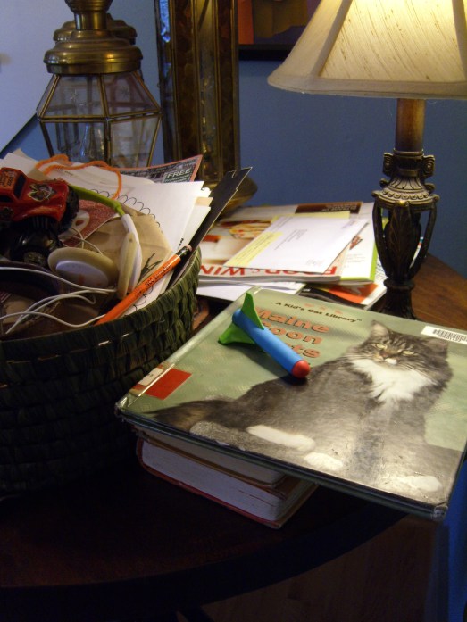 Here in the living room is the pile of unread (and some unopened) papers from the weekend. My husband gets the Sunday New York Times, which he does read, but somehow he didn’t get to it over the weekend while he was sole breadwinner AND parent-in-charge. He does most of his reading on his train commute. I keep trying to read during Mr. Nine’s karate class (assuming I don’t have Mr. Four on my lap), but the sensei is forever interrupting me with, “Now Moms and Dads, watch your children while they do x, y, z…”