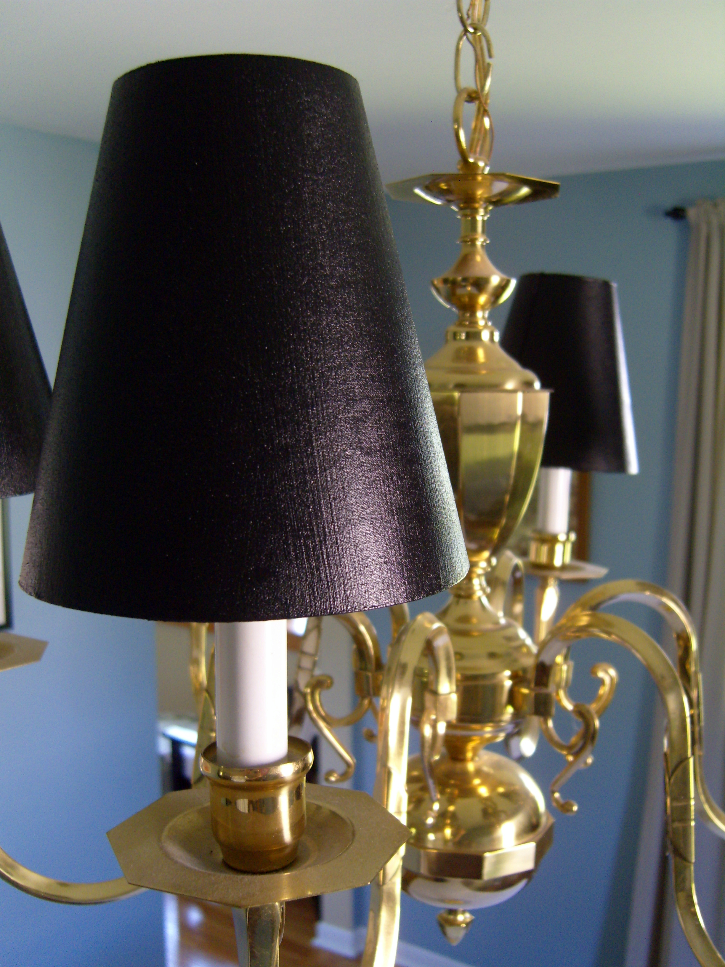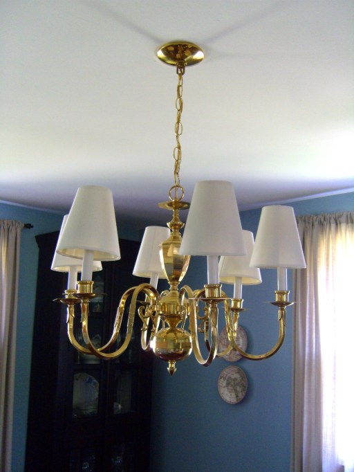 We have this brass chandelier in our dining room that came with the house. I don’t love it, but anything I really like is not exactly in the budget. A few years ago I bought some cheap Ikea lampshades for it, but there wasn’t any color selection, and they have yellowed and just look dingy.