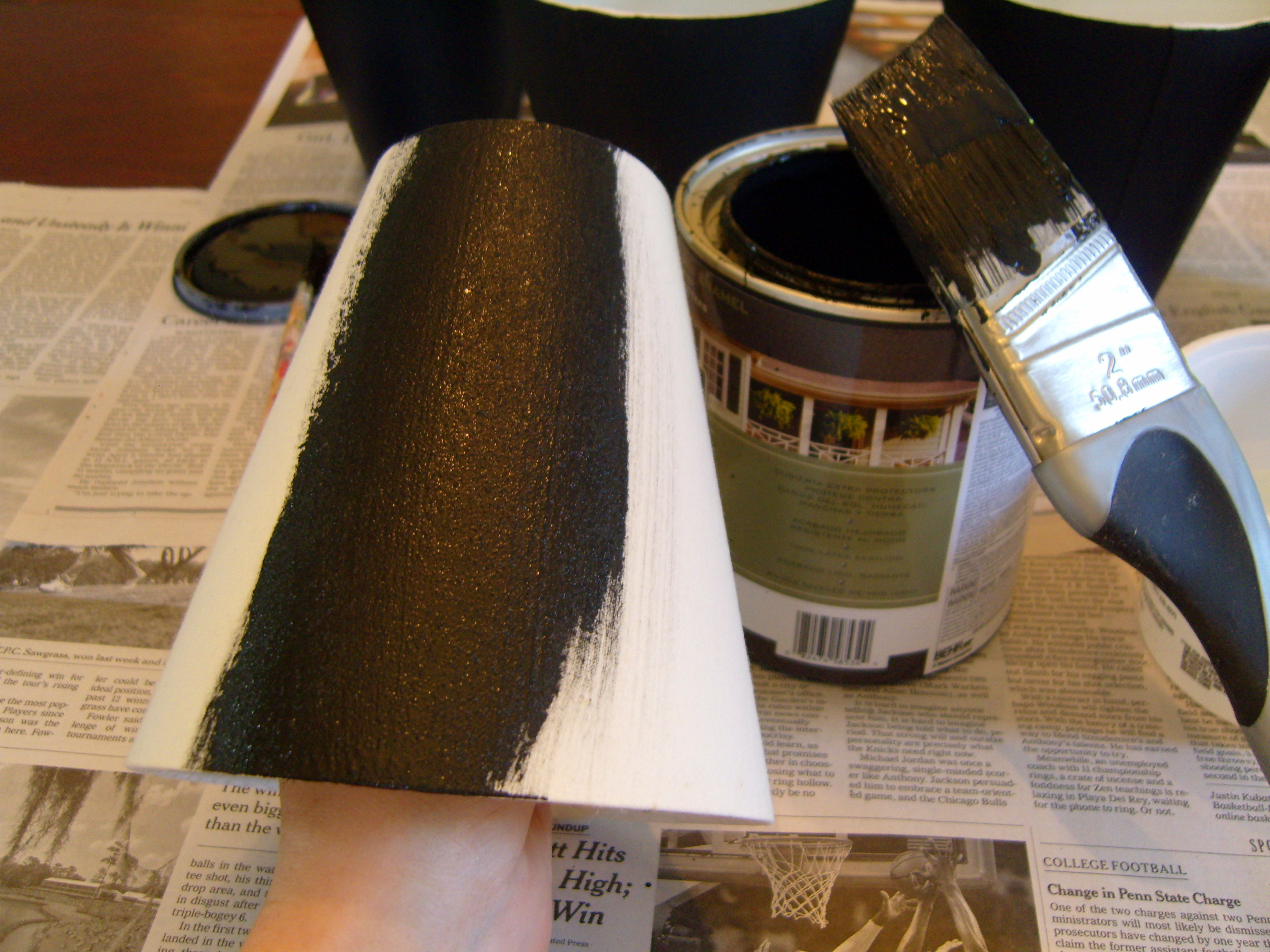 My kids accuse me of painting everything black. They exaggerate, but black seems to give everything a little more weight, a little more style. The new black shades will give the brass chandelier a reprieve until we find a fixture we love at a price we’re willing to pay. It could be years…