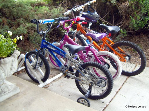 In the winter, we hang the bikes from hooks in the garage ceiling, but in the summer months, the kids need to be able to reach their bikes. Finally, it occurred to me that we needed somewhere besides the garage to park and lock the bikes; you know, like in the bike racks at school. Why couldn’t we have a bike rack?