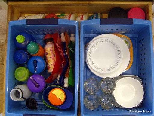 I emptied the drawer, wiped it down, and washed the baskets (seriously, where do all those crumbs come from?). Then I sorted. We still use the water bottles regularly, as well as a few plastic snack bowls. I moved the plastic cups to the new water cooler spot on the porch, and the plastic plates to the bin of picnic supplies in the basement. Hiding behind the baskets are thermoses for school lunches, Snack Traps (Little Four uses them on outings), and reusable kid cups from Sweet Tomatoes (bring your cup back and the drink is free).