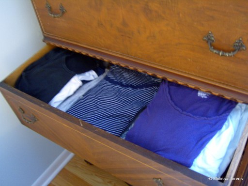 In any case, I’m nowhere near solving my style dilemmas, but at least my dresser drawers are tidy. I’ll keep reading style blogs like Ain’t No Mom Jeans (sometimes too trendy for me, but at least they’re practical!) and try not to succumb to $4 t-shirts at Target that look pilly after two washes.