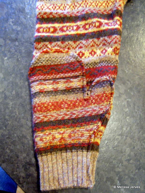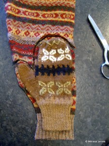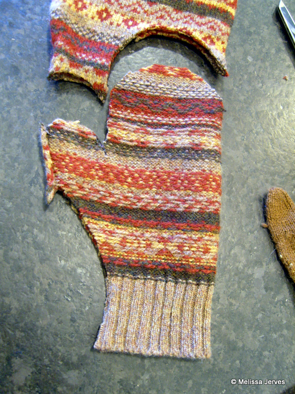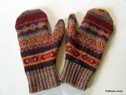 There were still those nice sleeves left, so I decided to make myself a new pair of mittens. I always have cold hands, and mittens hold in the heat better than gloves.