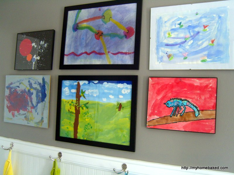 Gradually the kid art is taking over the house (family room, powder room, hall bath, upstairs hall, kids’ bedrooms…)! But it’s free, it’s colorful, and it makes me happy to look at it. My laundry room could use a dose of happy instead of cobwebs!