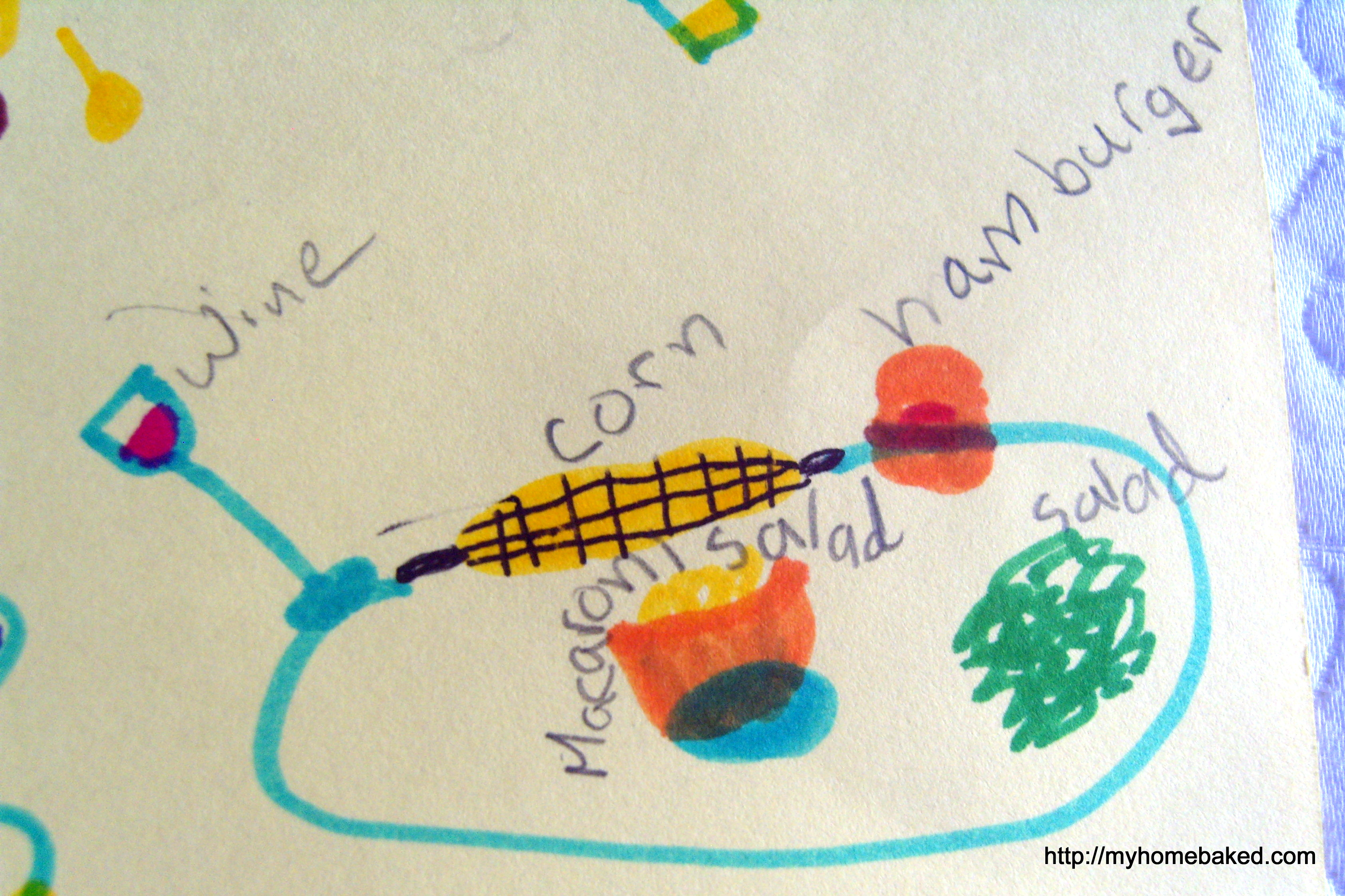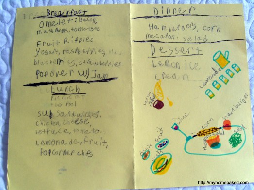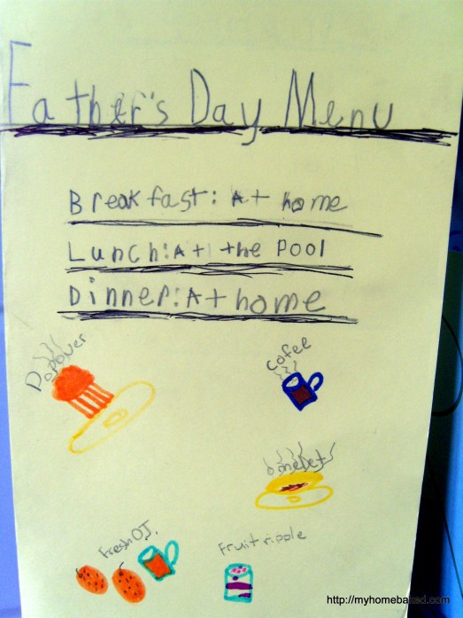 I hope all you fathers out there celebrated well yesterday. We all enjoyed the day, and for the first time, the kids really took charge of the festivities. They planned the menu, helped shop, and prepped most of the food, too. (The key to success was doing all the chopping and mixing possible the day before, restaurant kitchen style, so that the actual cooking took very little time away from the fun–a long afternoon at the pool–on Sunday.) They also helped smell every cologne in the store to help me choose a new bottle for dad. Dad had breakfast in bed, while the crew picnicked on the floor alongside.