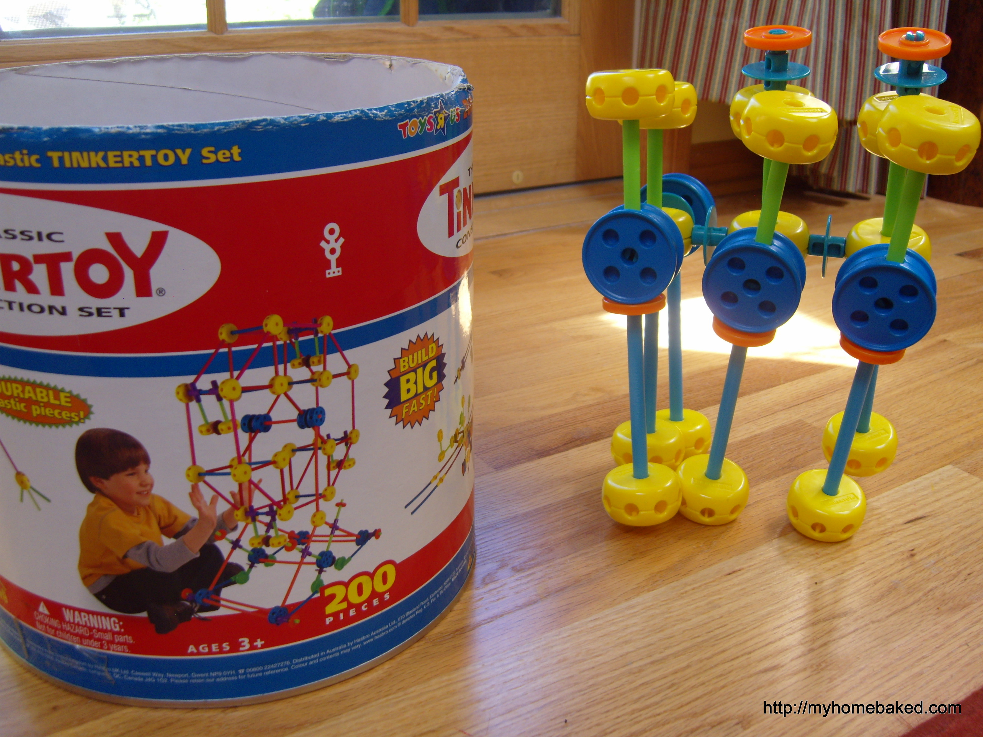 • Tinker Toys. Preschoolers can begin with these–most of the pieces are big enough for them to handle as they are still developing fine motor skills. But there is enough of a variety of parts that older children can continue to invent new constructions. We began with a small canister of wooden pieces and a few years later received a large one of plastic pieces. Together there are enough pieces for several kids to play together. The sets have evolved somewhat, but my kids and their friends keep on playing.