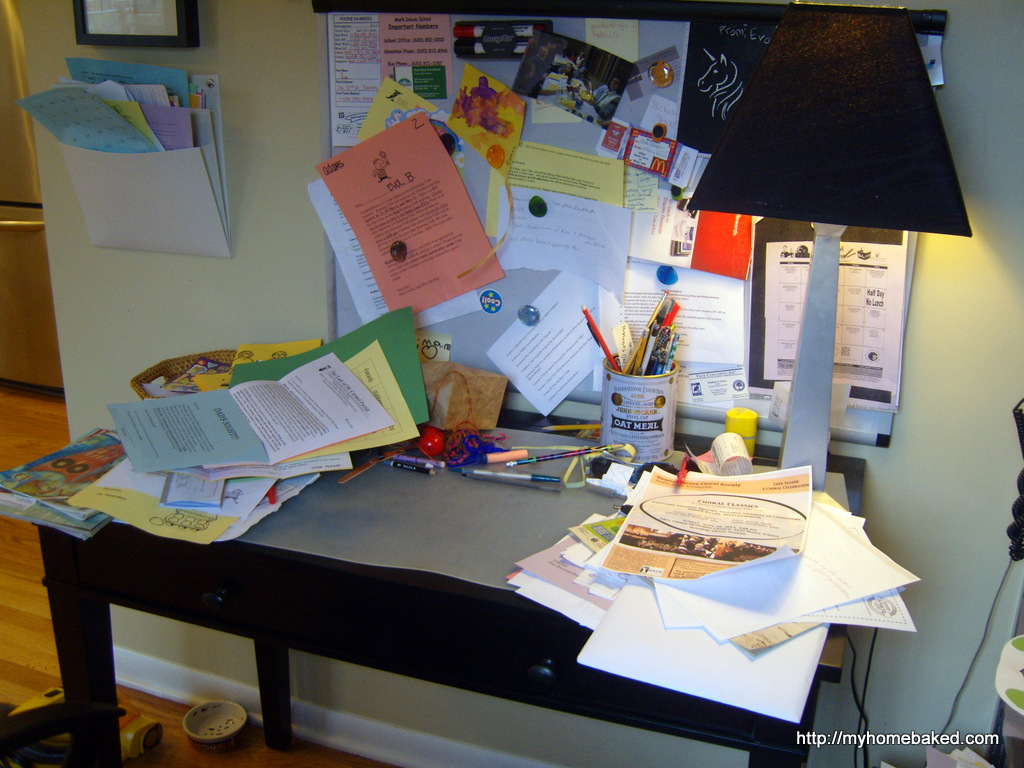 He pulled everything off the shelves (something I couldn’t do myself: heavy books and magazine files + recovering spine = NO) and wiped all the dust. We took a few minutes to sort through the cookbooks. We agreed on a couple to donate and loosely categorized the rest before putting them back on the shelves. Nearly all the cooking magazines got relocated to the basement. I spent a couple hours sorting through the kids’ school file boxes, mostly tossing stuff, but saving a few things for posterity. I dedicated one shelf to their summer schoolwork and one shelf for my files and some office supplies. I put away (or threw away) all the other bits and pieces that had piled up on my desk and shelves. I even cleaned off my memo board. Finally, I hung the new organizer that I got for my birthday.