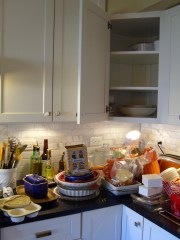 Step 4: Wipe off the shelves and put spices back in some kind of order. I put the most-used on the top shelf (garlic cellar, salts and peppers, and spices I tend to reach for several times a week). The second and third shelves have spices we don’t use as often. I grouped the baking spices together so they’re easier to reach for. In the past, I’ve attempted to alphabetize the spices, but I’ve learned that it’s silly to have cream of tartar front and center when I only use it a few times a year.