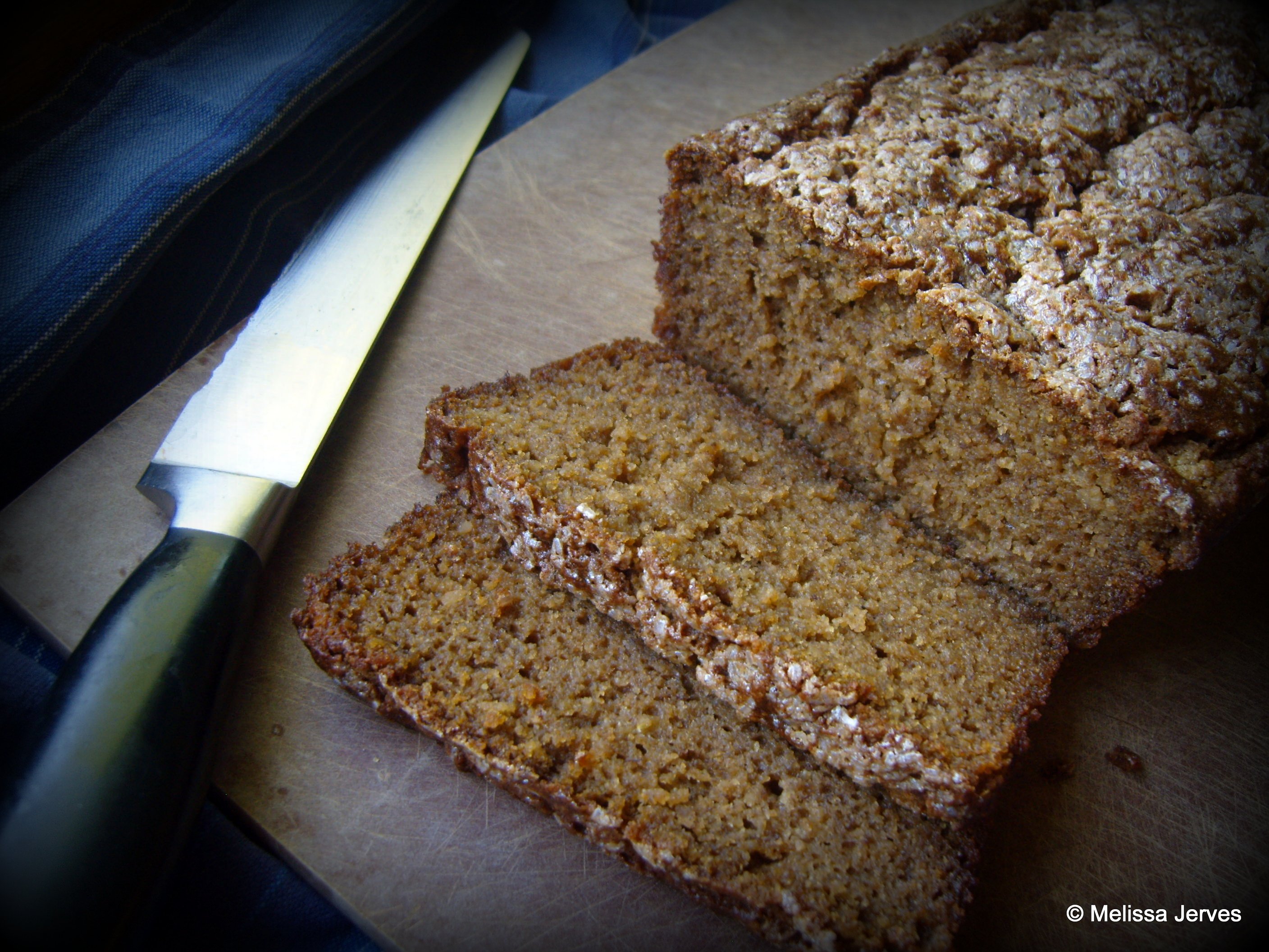Fall is creeping in, and I’m thrilled. I found one stray can of pumpkin puree in the pantry, and decided it was finally close enough to fall to use it. My family doesn’t seem to tire of muffins or quick breads, even when I stuff them full of whole grains and fiber. I’ve been meaning to mix up a container of multigrain flour, ever since I stocked the freezer with a beautiful variety of flours some months ago. And since I’m trying to cook in greater quantity, but less often, I baked enough for a loaf to eat right away, and some muffins to freeze for lunchboxes and quick breakfasts. This bread is incredibly moist, with a complex, fruity flavor and something reminiscent of gingerbread. I am tempted to retest the recipe with less butter, since there is so much fruit to maintain the moisture. If you try, let me know how it goes!