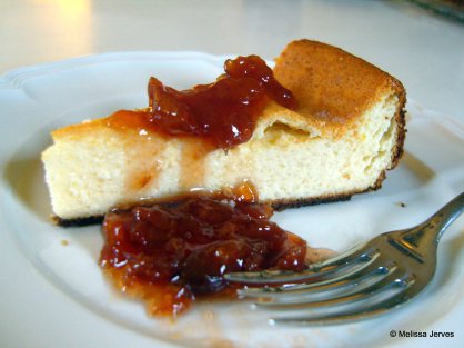 But back to yesterday. After reading a comment on another Käsekuchen recipe I dug up on the ‘net, I dashed over to our regular market that carries a wide selection of international foods. Sure enough, they had Swiss-style Twarog (apparently a Polish version of Quark) at only $3.99 a pound. Sold! I raced back home, mixed up the cake (I did contemplate the other recipe, because I’m fairly certain I used to eat Käsekuchen with a crust, but in the end, I went with Luisa’s simple crustless recipe–turns out, the farina in the pan magically creates a little crust), slid it into the oven, and then dashed off to the preschool carpool line. When we returned home, the warm, vanilla custardy aroma about knocked me over. People need to start baking cheesecake instead of burning scented candles.