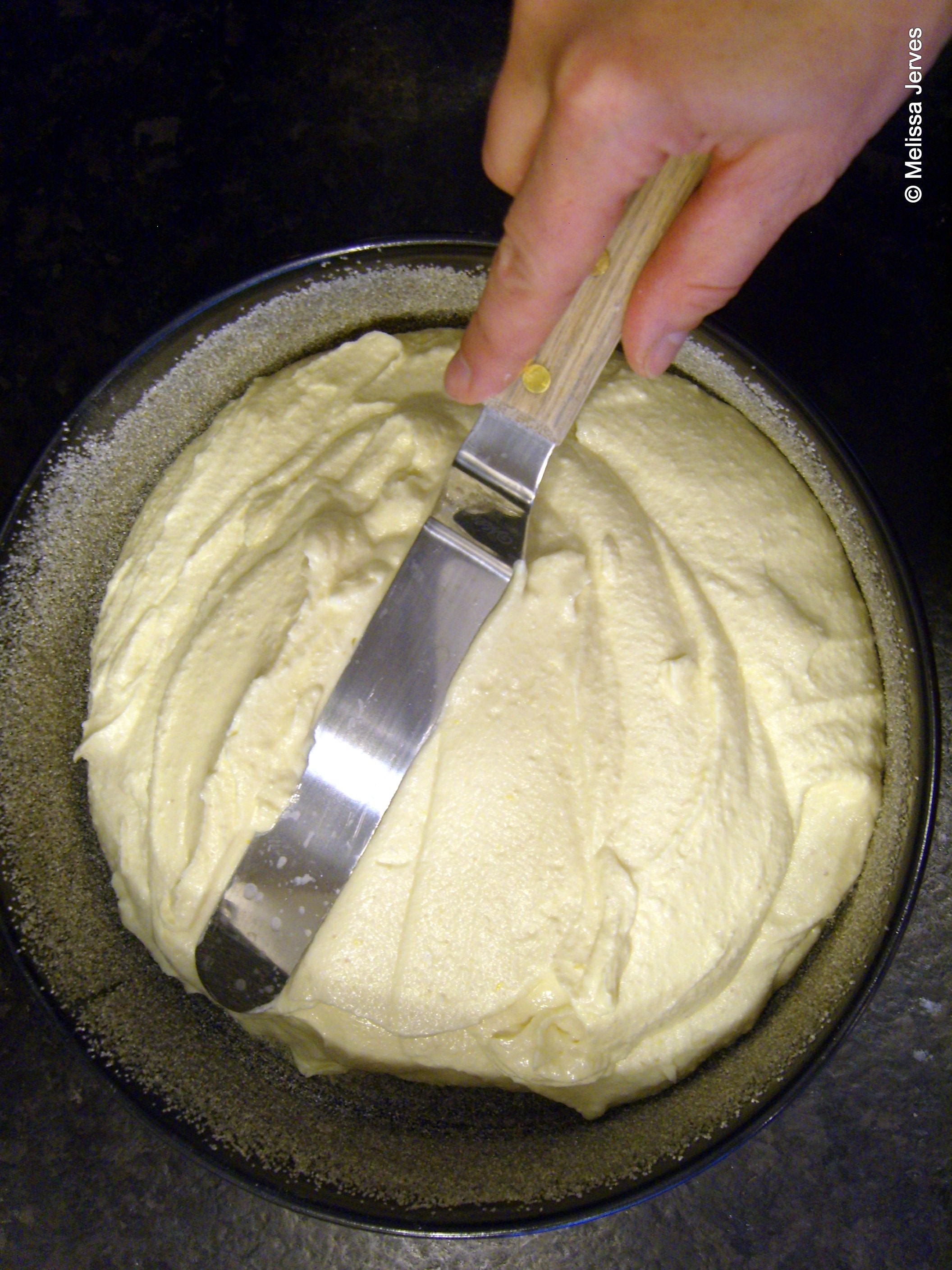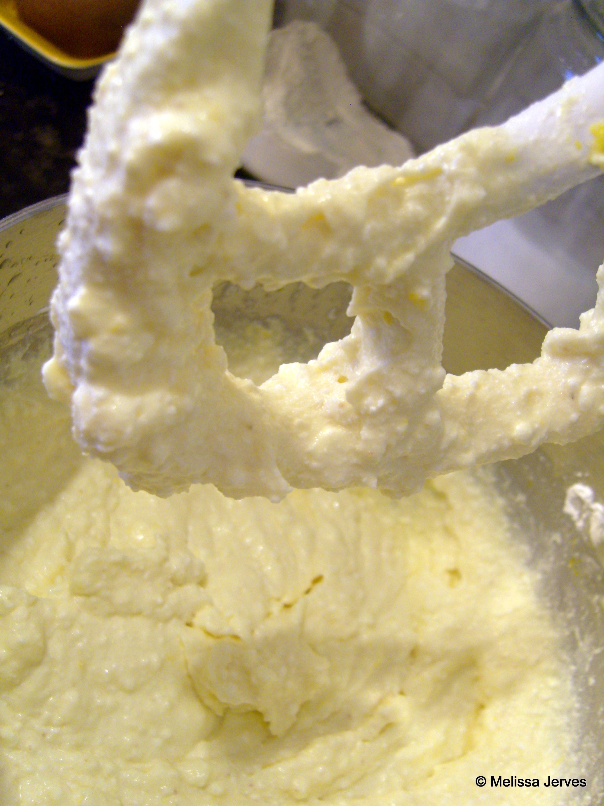 A few recipe notes, especially if you’ve read the book (go read it!). I had to adapt the instructions a bit from the original, perhaps because the cheese I used may not be as creamy as Quark. I first mixed the batter with the paddle attachment on my stand mixer, but the batter seemed lumpy with noticeable curds (see the first photo below), and the recipe said to beat until “smooth and creamy.” I switched to the whisk attachment, which didn’t help. Since I had seen recipes that used a mixture of cottage cheese with a little sour cream blended smooth in the food processor (after tasting the twarog, I think the cottage cheese/sour cream combo would be a fair substitute), I got out the immersion blender and it smoothed out the batter considerably (second photo). Maybe those curds would melt and smooth out on their own during baking, but I didn’t want to take the chance. So I recommend you use a food processor to mix the batter–it’s one step, and the batter will be smooth from the start.
