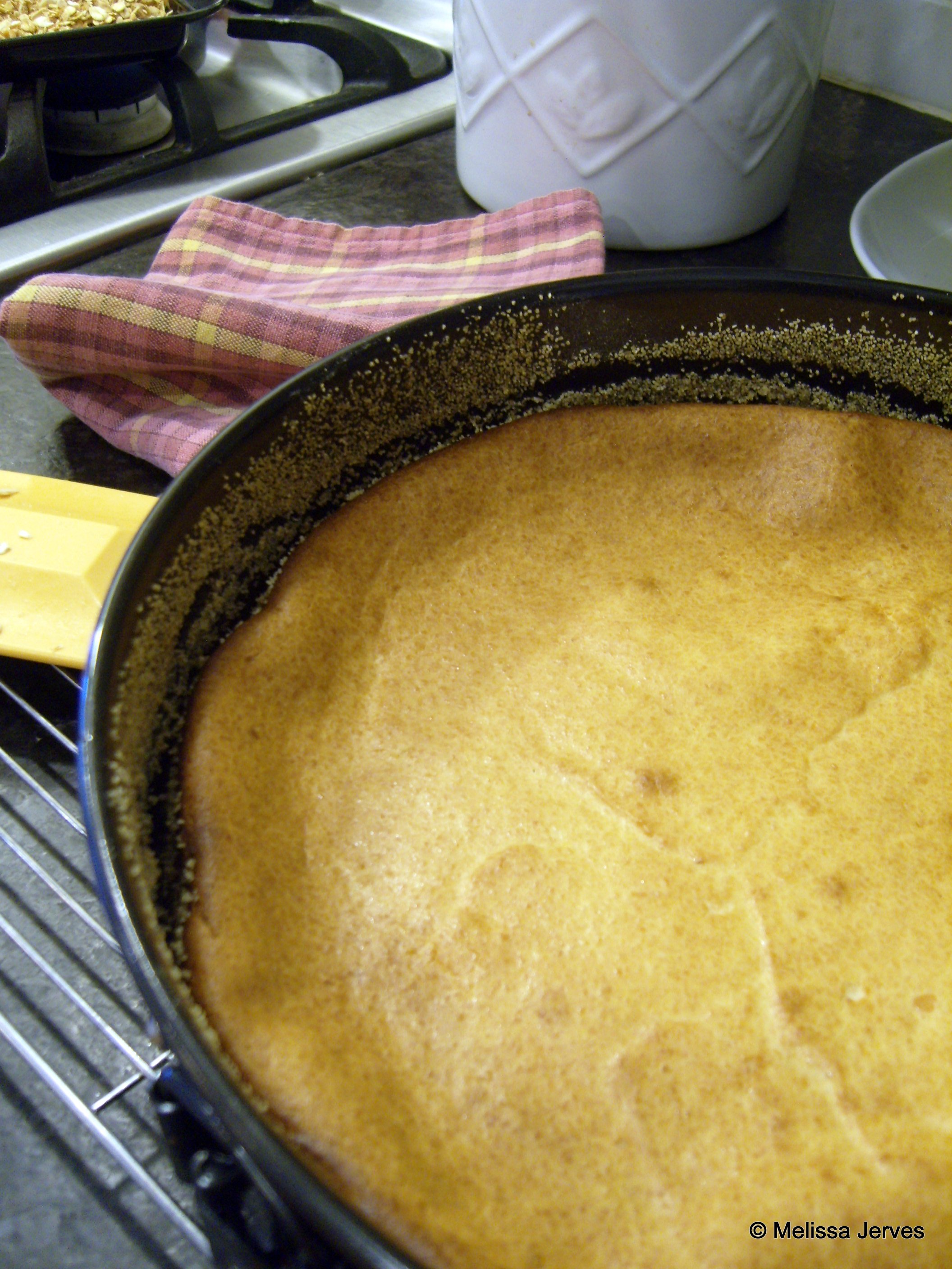 Even with those hiccups, it didn’t take long to put the cake together. It did take significantly longer to bake than the recommended 45 minutes. The center didn’t puff and turn golden brown until 75 minutes in, but this left the bottom of my cake just this side of burnt. I used a dark nonstick springform pan, which unmolded perfectly, but probably contributed to the overly-browned bottom. If your pan is dark, go ahead and put the cake in the middle of the oven (not the lower third), and remove it as soon as it puffs up and gets a little color on the top.