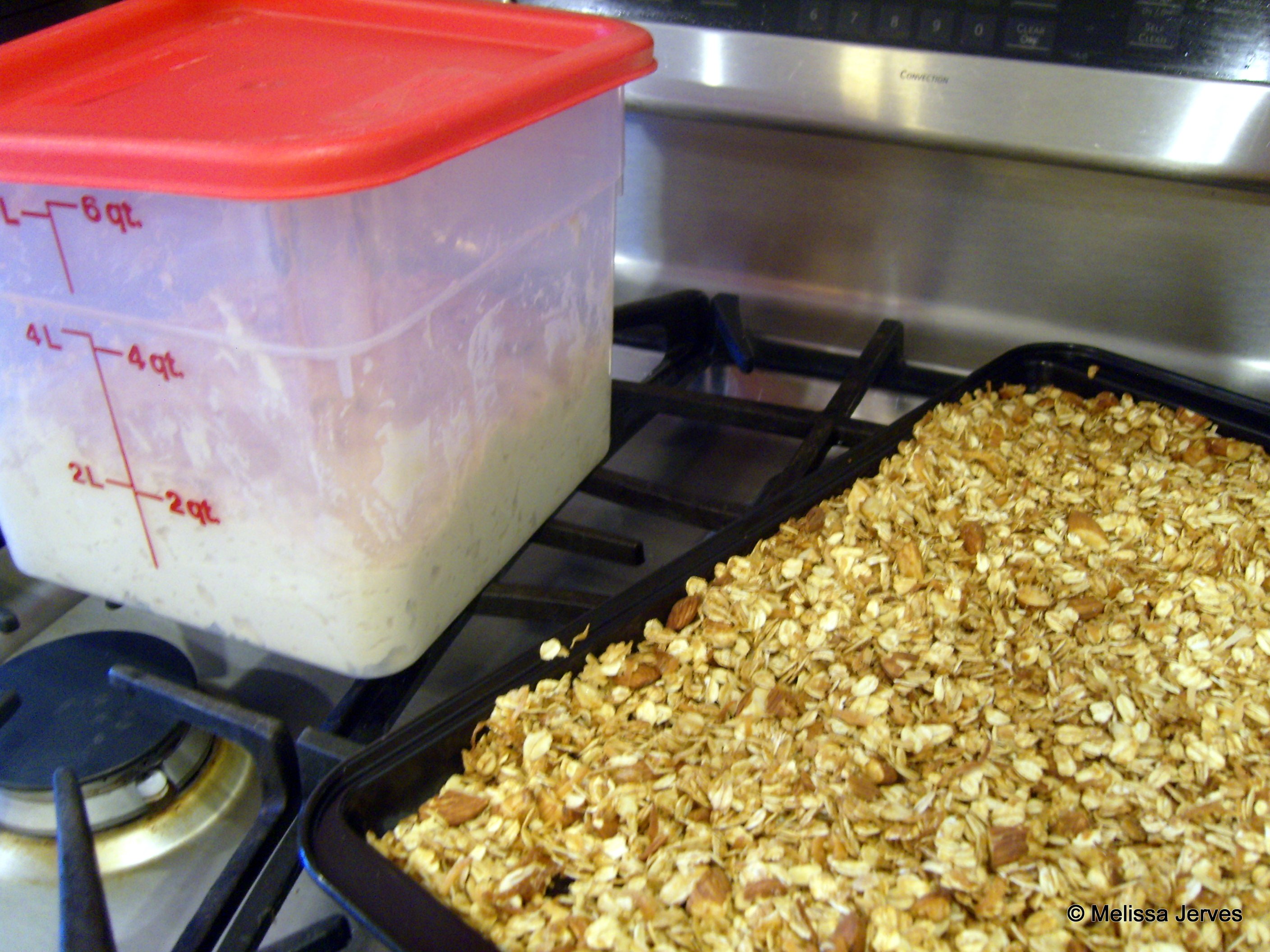 I think it must have been that aroma that spurred me to stay in the kitchen and mix up a batch of buttermilk bread dough (that, and realizing that there is but a single slice of bread left in the cupboard), and some chocolate granola (which I fully intend to hoard). Little Four kept himself busy in the basement all afternoon with playdough and some vintage Muppet Show (especially the Joel Grey episode). It was late in the day before I got to the dirty dishes, but by that time I was scraping every last cake crumb and drop of cherry preserves off my plate.