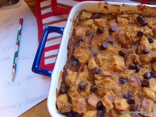 Butter (or use cooking spray) a medium baking dish (8″ x 8″ or a deep dish pie plate). Put the bread cubes and chocolate chips into the dish. In a large bowl, whisk together the remaining ingredients. Pour over the bread and chocolate and mix gently so that all the cubes soak up some custard. Turn on the oven to 350 degrees and let the pudding soak until the oven is ready. Bake for about 40 minutes, until a thin knife inserted in the middle comes out clean.